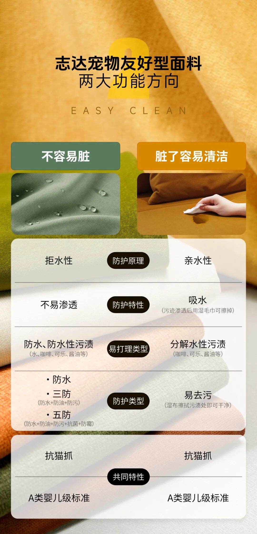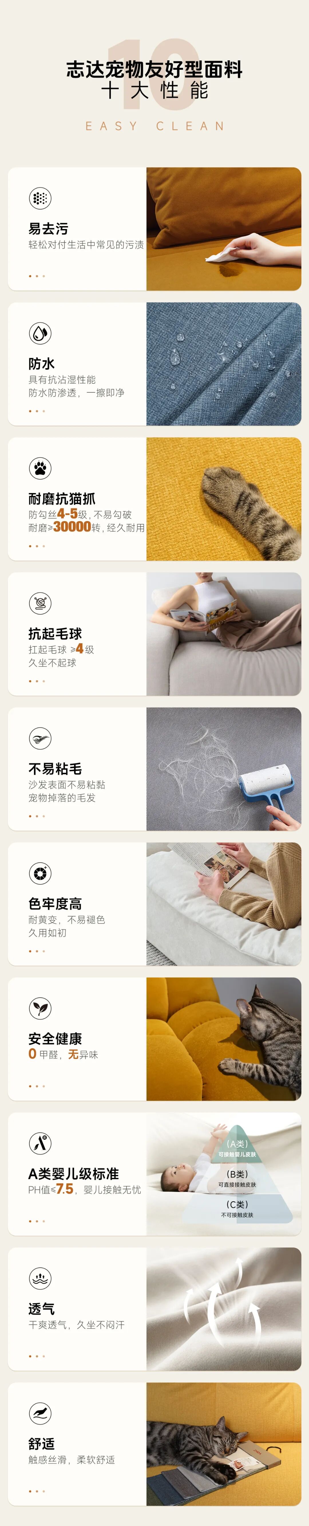 易去污 | 防水 |抗猫抓 | 轻松易打理 | A类婴儿级标准