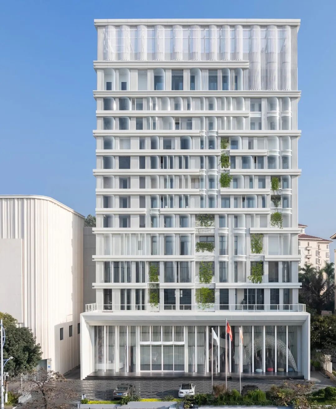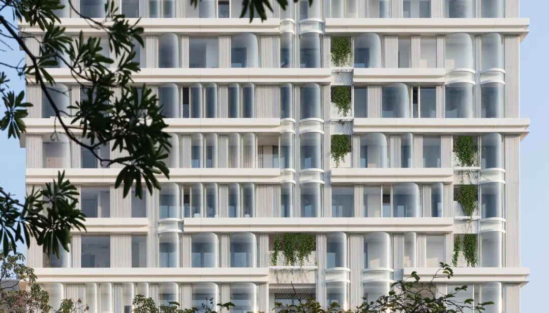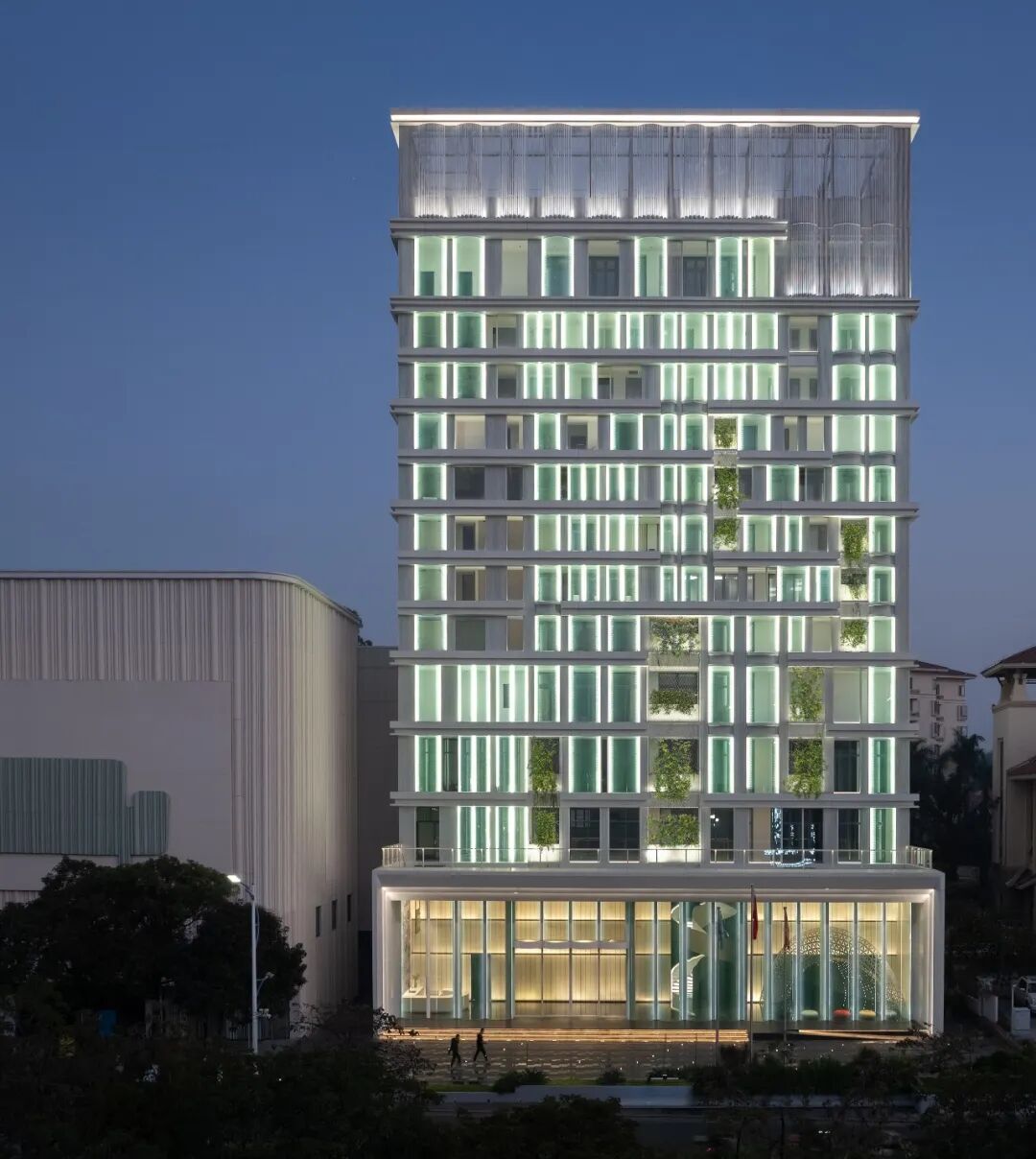 To reduce the excessive sunlight and large amount of thermal radiation due to east-west facing of the main building, the facade adopts a double skin sunshade and heat dissipation design. The outer layer is formed by a series of hot curved glass curtains with ventilation louvers to form a shading device, which has ventilation and breathability performance; The continuous green planted balcony between the curved glass and the building structure helps efficiently cooling down the hot air; The inner layer is made of low-e insulation glass to further reduce heat radiation and indoor temperature. The different floors inside the building have opened up many cross story atrium spaces, enhancing air circulation and heat dissipation effects, as well as increasing employee interaction and communication.