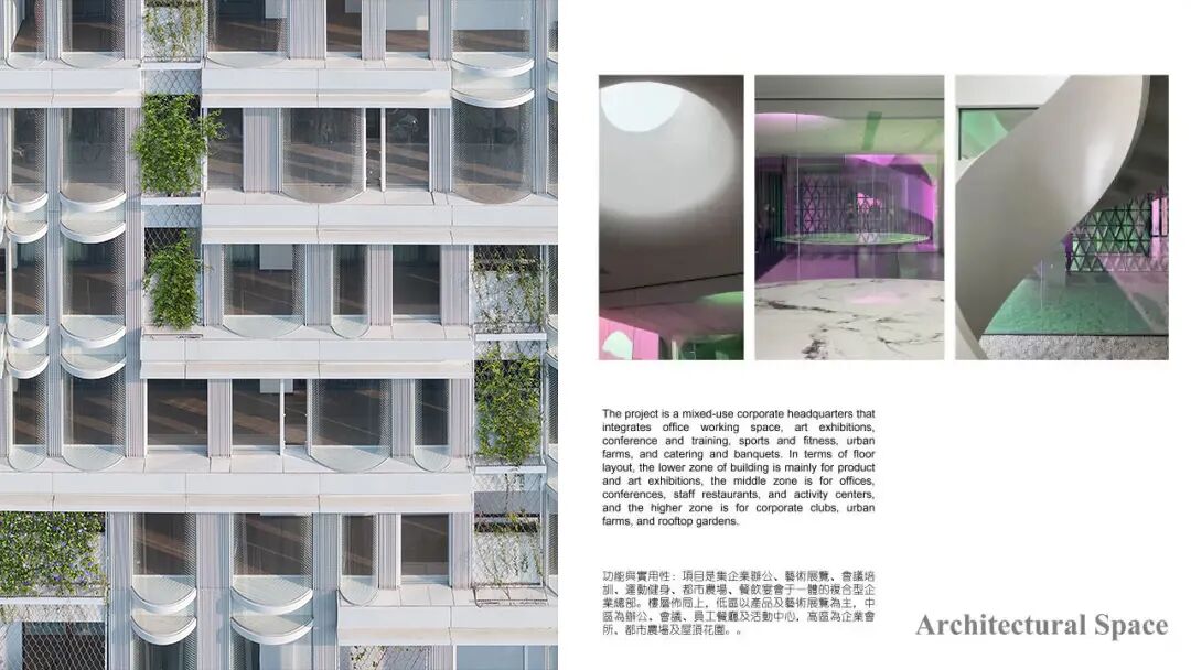 The project is a mixed-use corporate headquarters that integrates office working space, art exhibitions, conference and training, sports and fitness, urban farms, and catering and banquets. In terms of floor layout, the lower zone of building is mainly for product and art exhibitions, the middle zone is for offices, conferences, staff restaurants, and activity centers, and the higher zone is for corporate clubs, urban farms, and rooftop gardens.