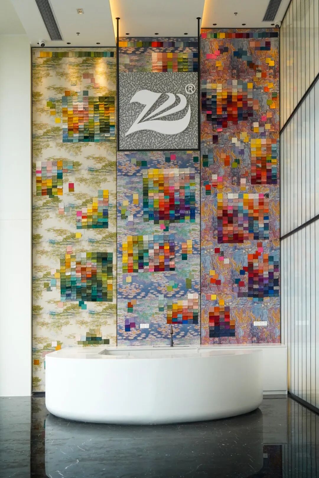 主体建筑风格体现纺织企业优雅稳重、柔软而具亲和力的气质,立面创新地采用了热弯弧形玻璃幕墙,连续而透明的曲面玻璃墙体创造了一种丝滑柔软的立面情绪,面向城市干道展现了时尚流畅、典雅高贵的企业形象,华灯初上,令人一见难忘。室内空间融入“泛美术馆”概念,内部不同楼层通过动线重组,融入“垂直风景”,以一种 “游园”的概念生成一步一景、富有东方造园意境的空间序列及光影效果。