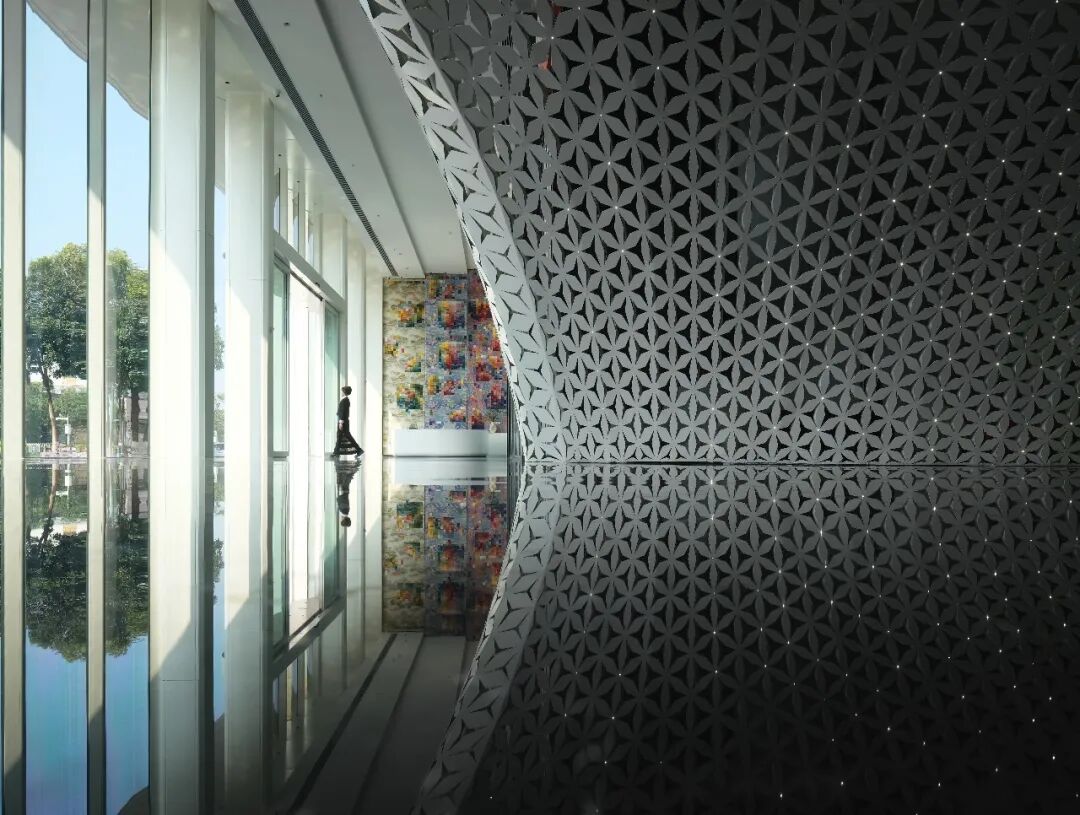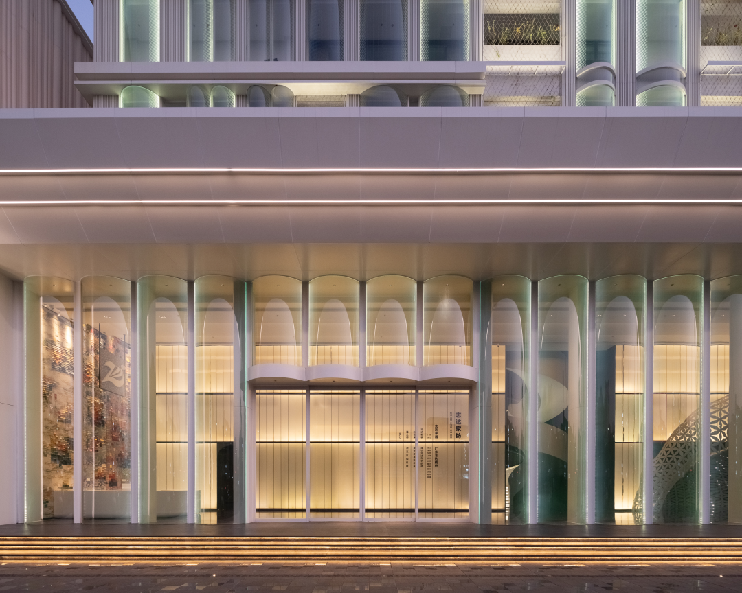The main architecture embodies the elegant, stable, soft and approachable temperament for a textile enterprises headquarters. The facade innovatively adopts a hot curved glass curtain wall. This continuous and transparent curved glass wall creates a silky and soft facade emotion. It presents a fashionable, smooth, elegant and noble corporate image facing the city's main roads. With the lights on at twilight time, it becomes absolutely unforgettable at first sight by most people. The indoor space incorporates the concept of "Universal Art Museum", with different floors reorganized through flow circulation and incorporating "vertical scenery", creating a space sequence and light and shadow effects with a "garden tour" concept that is deeply rooted in Eastern gardening temperament.